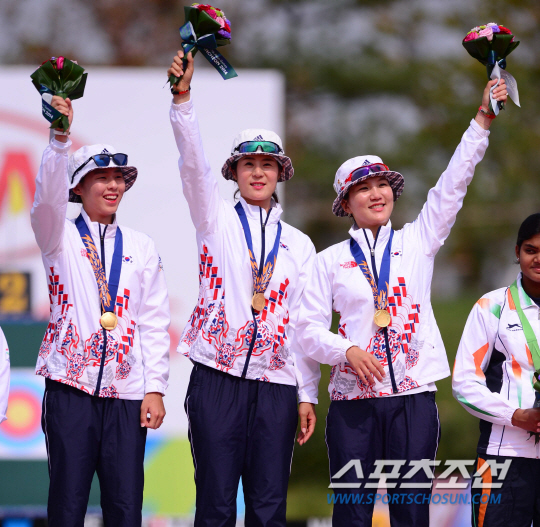 27일 오후 인천 계양아시아드 양궁경기장에서 2014 아시안게임 양궁 컴파운드 여자 단체 시상식이 열렸다. 금메달을 차지한 한국 선수들이 시상대 위에서 환호하고 있다.