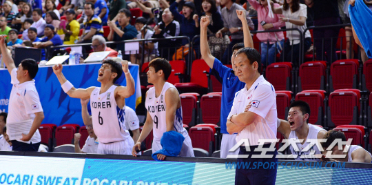 27일 오후 인천 삼산월드체육관에서 2014 아시안게임 남자 농구 한국과 필리핀의 경기가 열렸다. 4쿼터 한국 문태종의 동점 3점슛때 선수들이 환호하고 있다.