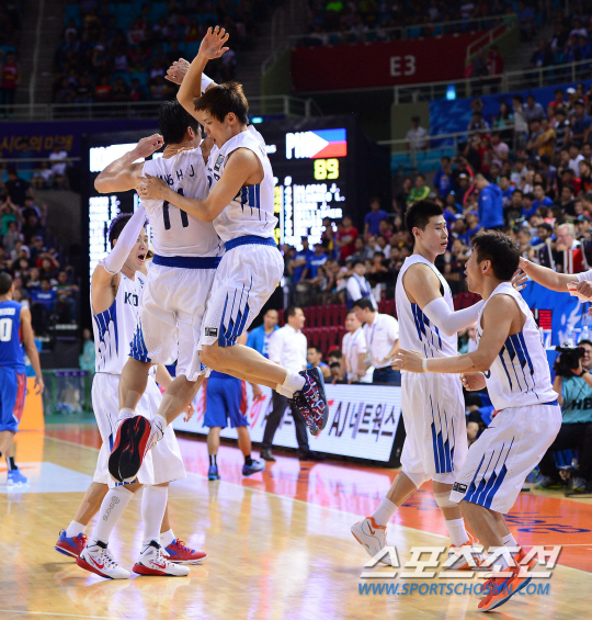 27일 오후 인천 삼산월드체육관에서 2014 아시안게임 남자 농구 한국과 필리핀의 경기가 열렸다. 필리핀에 승리한 한국 선수들이 환호하고 있다.