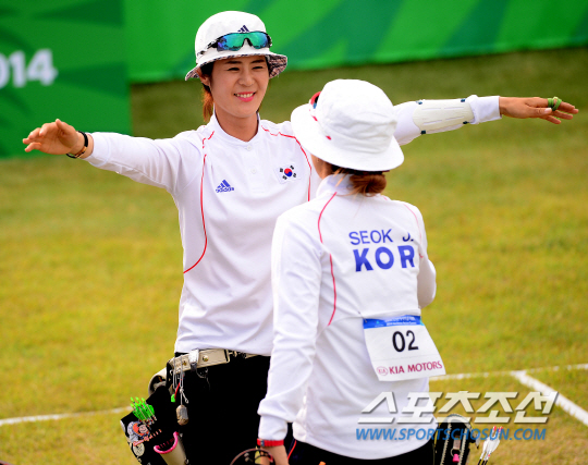 인천 아시안게임 양궁 컴파운드 여자 개인 결승전이 27일 인천 계양아시아드양궁경기장에서 열렸다. 한국 석지현과 최보민이 나란히 결승에 올라 대결을 펼친 가운데 최보미가 승리를 거두며 금메달을 획득했다. 최보민이 석지현에게 다가가 포옹을 하고 있다.
