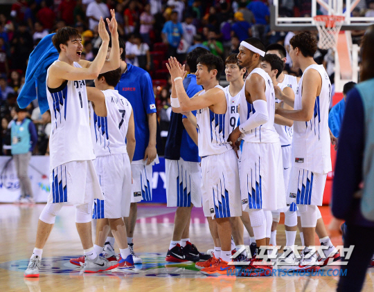 27일 오후 인천 삼산월드체육관에서 2014 아시안게임 남자 농구 한국과 필리핀의 경기가 열렸다. 필리핀에 승리를 거둔 한국 선수들이 환호하고 있다.