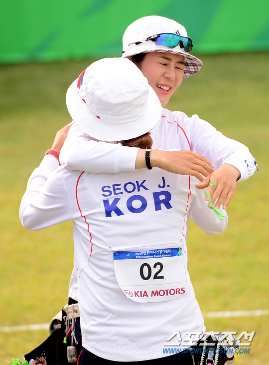 인천 아시안게임 양궁 컴파운드 여자 개인 결승전이 27일 인천 계양아시아드양궁경기장에서 열렸다. 한국 석지현과 최보민이 나란히 결승에 올라 대결을 펼친 가운데 최보미가 승리를 거두며 금메달을 획득했다. 최보민이 석지현과 포옹을 하고 있다.