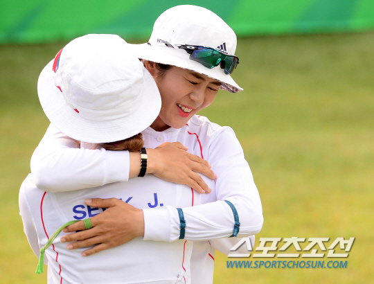 인천 아시안게임 양궁 컴파운드 여자 개인 결승전이 27일 인천 계양아시아드양궁경기장에서 열렸다. 한국 석지현과 최보민이 나란히 결승에 올라 대결을 펼친 가운데 최보미가 승리를 거두며 금메달을 획득했다. 최보민이 석지현과 포옹을 하고 있다.