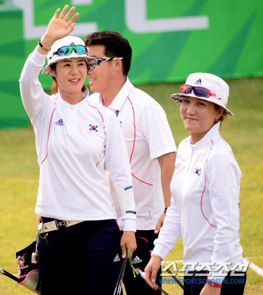 인천 아시안게임 양궁 컴파운드 여자 개인 결승전이 27일 인천 계양아시아드양궁경기장에서 열렸다. 한국 석지현과 최보민이 나란히 결승에 올라 대결을 펼친 가운데 최보미가 승리를 거두며 금메달을 획득했다. 최보민과 석지현이 밝게 웃고 있다.