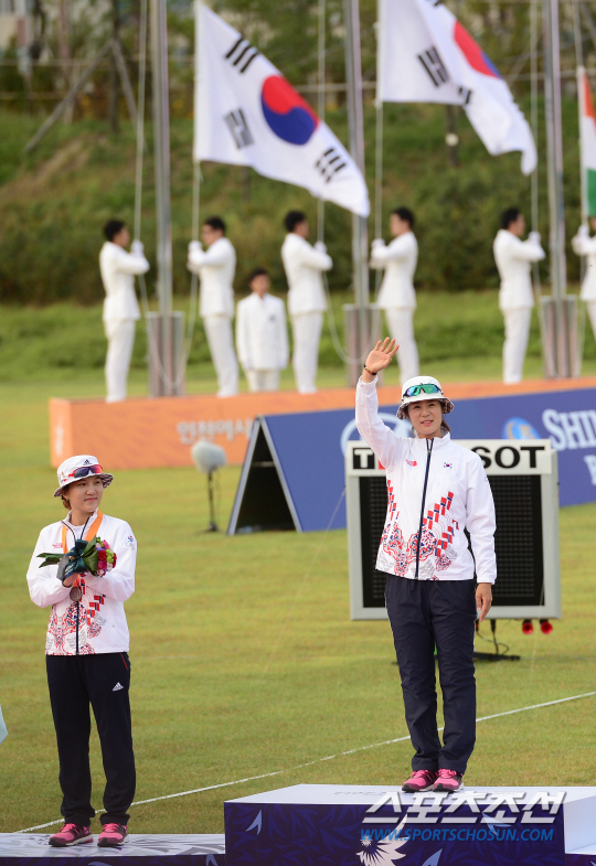 인천 아시안게임 양궁 컴파운드 여자 개인 결승전이 27일 인천 계양아시아드양궁경기장에서 열렸다. 한국 석지현과 최보민이 나란히 결승에 올라 대결을 펼친 가운데 최보미가 승리를 거두며 금메달을 획득했다. 시상식에서 금메달을 딴 최보민과 은메달을 딴 석지현이 단상에 올라 있다.