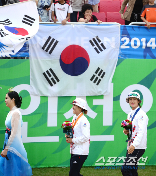 인천 아시안게임 양궁 컴파운드 여자 개인 결승전이 27일 인천 계양아시아드양궁경기장에서 열렸다. 한국 석지현과 최보민이 나란히 결승에 올라 대결을 펼친 가운데 최보미가 승리를 거두며 금메달을 획득했다. 시상식에서 금메달을 딴 최보민과 은메달을 딴 석지현이 시상식을 마친 후 걸어가고 있다.