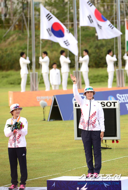 인천 아시안게임 양궁 컴파운드 여자 개인 결승전이 27일 인천 계양아시아드양궁경기장에서 열렸다. 한국 석지현과 최보민이 나란히 결승에 올라 대결을 펼친 가운데 최보미가 승리를 거두며 금메달을 획득했다. 시상식에서 금메달을 딴 최보민과 은메달을 딴 석지현이 단상에 오르고 있다.