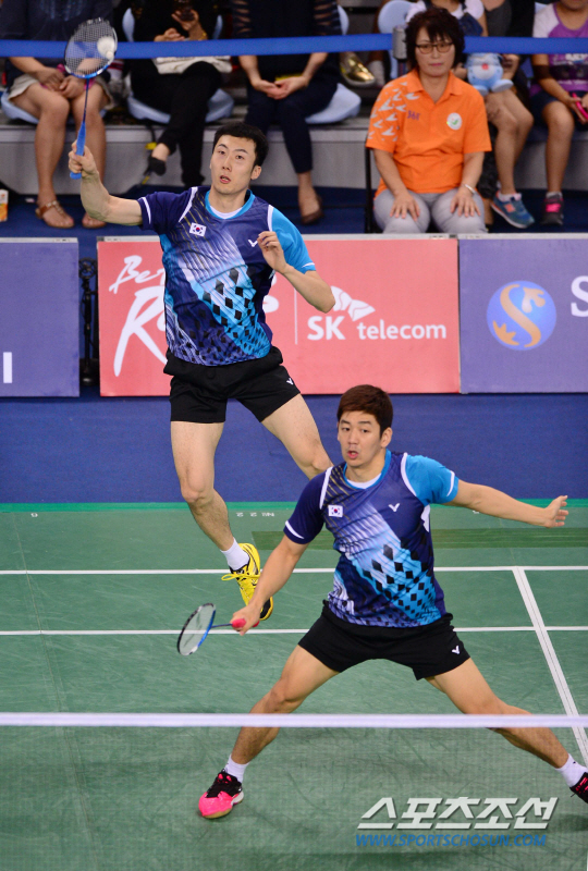 27일 오후 인천 계양체육관에서 2014 인천 아시안게임 배드민턴 남자 복식 4강전 한국과 말레이시아의 경기가 열렸다. 유연성 말레이시아 진영을 향해 스메싱 공격을 하고 있다.