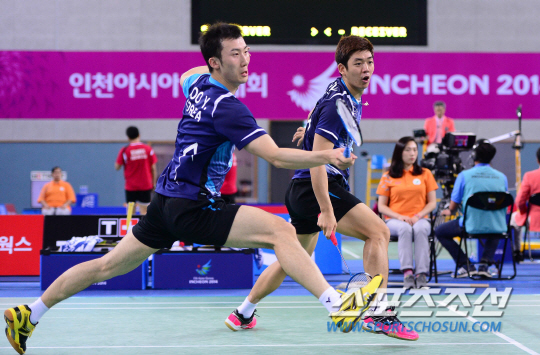 27일 오후 인천 계양체육관에서 2014 인천 아시안게임 배드민턴 남자 복식 4강전 한국과 말레이시아의 경기가 열렸다. 이용대-유연성이 말레이시아의 공격을 받아내고 있다.