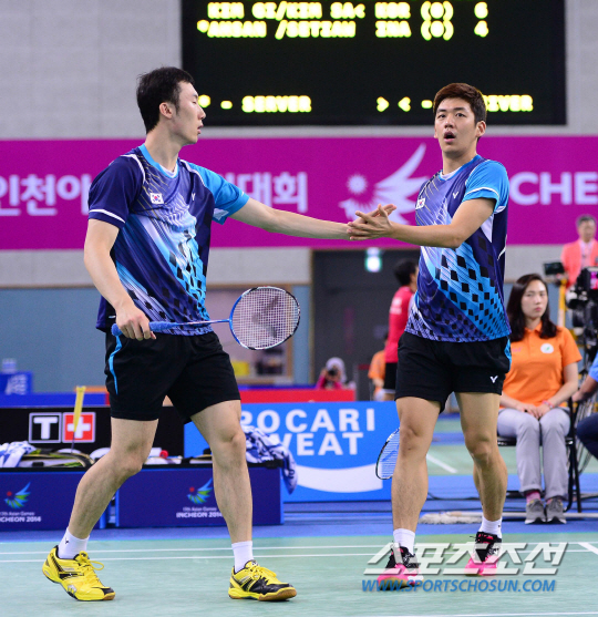 27일 오후 인천 계양체육관에서 2014 인천 아시안게임 배드민턴 남자 복식 4강전 한국과 말레이시아의 경기가 열렸다. 이용대-유연성이 공격을 성공시킨 후 악수를 나누고 있다.