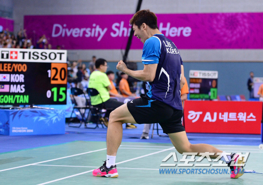 27일 오후 인천 계양체육관에서 2014 인천 아시안게임 배드민턴 남자 복식 4강전 한국과 말레이시아의 경기가 열렸다. 말레이시아에 승리하며 결승행을 확정지은 이용대가 환호하고 있다.