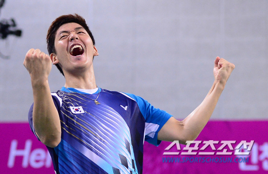 27일 오후 인천 계양체육관에서 2014 인천 아시안게임 배드민턴 남자 복식 4강전 한국과 말레이시아의 경기가 열렸다. 말레이시아에 승리하며 결승행을 확정지은 이용대가 환호하고 있다.