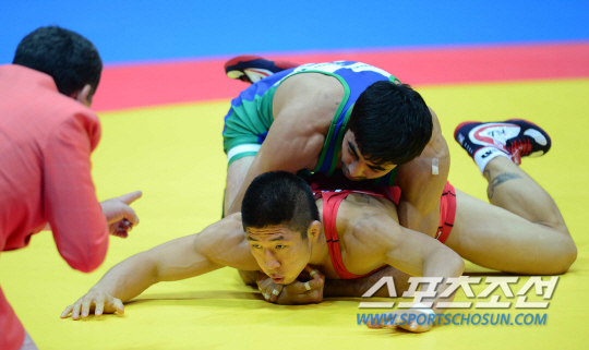 인천 아시안게임 레슬링 남자 자유형 70KG급 결승전이 27일 인천 도원체육관에서 열렸다. 한국 오만호가 우즈베키스탄 압두라크모노프와 대결을 펼치고 있다. 오만호는 2-7로 패하며 은메달을 획득했다.