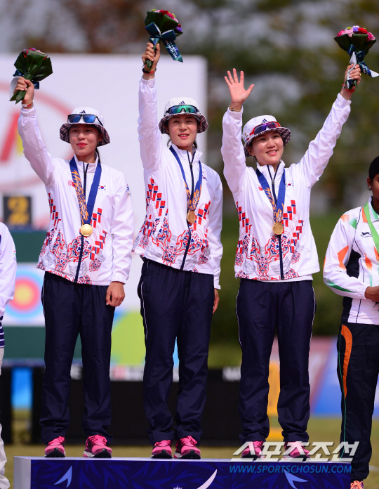 27일 오후 인천 계양아시아드 양궁경기장에서 2014 아시안게임 양궁 컴파운드 여자 단체 결승 한국과 인도의 경기가 열렸다. 금메달을 차지한 한국 선수들이 시상식에서 환호하고 있다. 인천=김경민 기자 kyungmin@sportschosun.com / 2014.09.27.