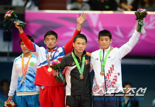 인천 아시안게임 레슬링 남자 자유형 57KG급 경기가 27일 인천 도원체육관에서 열렸다. 북한 정학진이 금메달, 카자흐스탄 칼리예프 은메달, 한국 윤준식과 몽고 마트볼드가 동메달을 획득한 가운데 시상식이 열리고 있다. 인천=정재근 기자 cjg@sportschosun.com