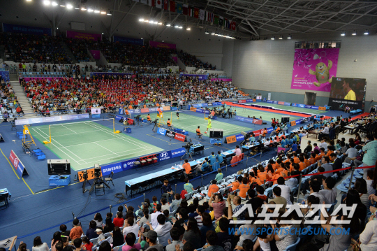 배드민턴의 셔틀콕의 무게는 약 5g(규정상 4.74~5.5g). 거위털로 만들어 매우 가볍다. 세계 최고 수준 선수들의 스매시는 시속 200㎞까지 나온다. 그런데 이 셔틀콕이 바람의 영향을 많이 받는다. 배드민턴을 한 번이라고 야외에서 쳐봤다면 금방 알 수 있다. 바람을 등지고 치는 쪽과 바람을 정면으로 보고 치는 쪽은 완전히 다른 상황에 놓인다. 그래서 엘리트 선수들의 경기는 실내에서 벌어진다. 그런데 실내에서도 바람이 전혀 없을 수는 없다. 조금씩 불고 그 바람을 잘 이용하는 쪽이 유리할 수 있다. 2014 인천아시안게임 배드민턴 남자 단체전 결승 23일 인천 계양체육관에서 열렸다. 배드민턴을 관람하기 위해 많은 팬들이 자리를 가득 메우고 있다. 인천=허상욱 기자 wook@sportschosun.com/2014.09.23/