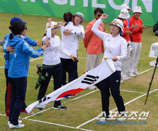 28일 인천 계양아시아드양궁장에서 2014 인천아시아경기대회 여자 양궁 리커브 단체전 경기가 열렸다. 여자 양궁은 1998년 방콕대회부터 2010년 광저우대회까지 4연패에 성공했다. 이번에 금메달을 따며 5연패를 달성했다. 금메달을 차지한 여자 양궁 대표팀 선수들이 기쁨의 눈물을 흘리고 있다.