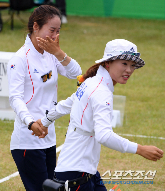 28일 인천 계양아시아드양궁장에서 2014 인천아시아경기대회 여자 양궁 리커브 단체전 경기가 열렸다. 여자 양궁은 1998년 방콕대회부터 2010년 광저우대회까지 4연패에 성공했다. 이번에 금메달을 따며 5연패를 달성했다. 어깨 부상으로 출전권을 양보한 주현정(왼쪽)이 금메달이 확정되자 동료들과 함께 뜨거운 눈물을 흘리고 있다.
