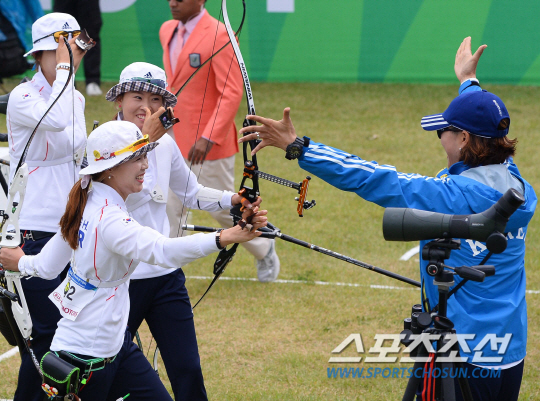 28일 인천 계양아시아드양궁장에서 2014 인천아시아경기대회 여자 양궁 리커브 단체전 경기가 열렸다. 여자 양궁은 1998년 방콕대회부터 2010년 광저우대회까지 4연패에 성공했다. 이번에 금메달을 따며 5연패를 달성했다. 여자대표팀 선수들이 금메달이 확정되자 환호하고 있다.