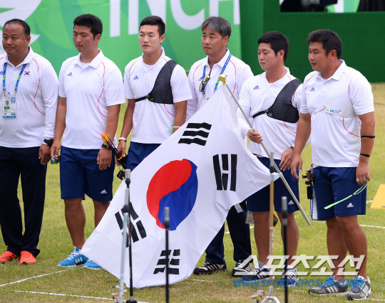 28일 인천 계양아시아드양궁장에서 2014 인천아시아경기대회 남자 양궁 리커브 단체전 경기가 열렸다. 동메달을 차지한 남자 양궁 선수들이 금메달이 확정되자 기뻐하고 있다.