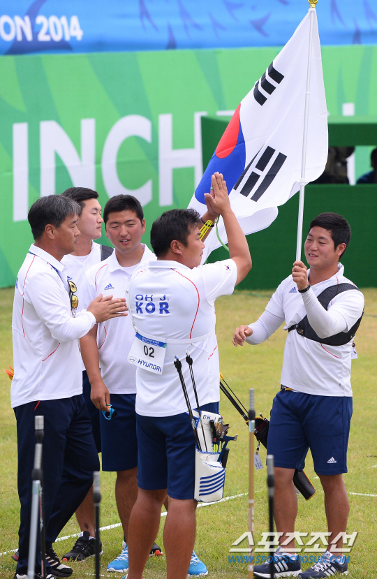 28일 인천 계양아시아드양궁장에서 2014 인천아시아경기대회 남자 양궁 리커브 단체전 경기가 열렸다. 동메달을 차지한 남자 양궁 선수들이 금메달이 확정되자 기뻐하고 있다.