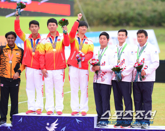 28일 인천 계양아시아드양궁장에서 2014 인천아시아경기대회 남자 양궁 리커브 단체전 경기가 열렸다. 시상식에서 동메달을 차지한 남자 양궁 대표팀 선수들이 포즈를 취하고 있다.