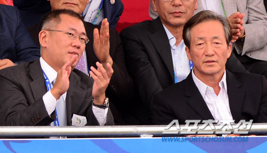 28일 인천 계양아시아드양궁장에서 2014 인천아시아경기대회 여자 양궁 리커브 개인전 결선 4강전 경기가 열렸다. 아시아양궁연맹 정의선 회장(왼쪽)이 정몽준 전 국회의원과 함께 경기를 관전하고 있다.