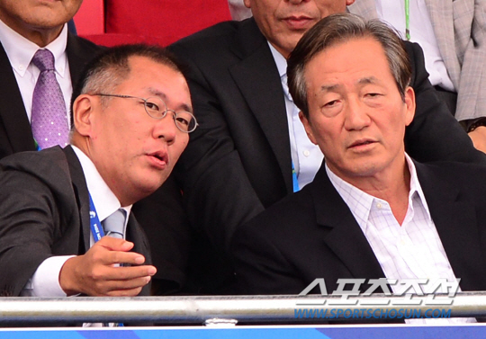 28일 인천 계양아시아드양궁장에서 2014 인천아시아경기대회 여자 양궁 리커브 개인전 결선 4강전 경기가 열렸다. 아시아양궁연맹 정의선 회장(왼쪽)이 정몽준 전 국회의원과 함께 경기를 관전하고 있다.