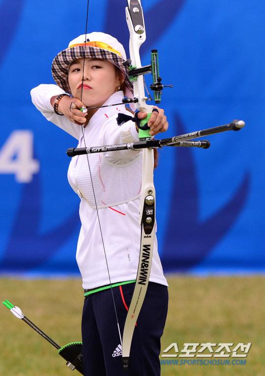 28일 인천 계양아시아드양궁장에서 2014 인천아시아경기대회 여자 양궁 리커브 개인전 결선 4강전 경기가 열렸다. 여자양궁 개인전 결승에 진출한 장혜진이 4강전에서 활시위를 당기고 있다.
