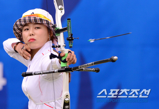 28일 인천 계양아시아드양궁장에서 2014 인천아시아경기대회 여자 양궁 리커브 개인전 결선 4강전 경기가 열렸다. 여자양궁 개인전 결승에 진출한 장혜진이 4강전에서 활시위를 당기고 있다.