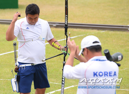 28일 인천 계양아시아드양궁장에서 2014 인천아시아경기대회 남자 양궁 리커브 개인전 경기가 열렸다. 4강전에서 오진혁이 결승 진출이 확정되자 주먹을 불끈 쥐어보이고 있다.