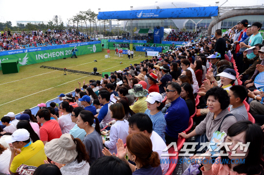 28일 인천 계양아시아드양궁장에서 2014 인천아시아경기대회 남녀 양궁 리커브 단체전과 개인전 결선 경기가 열렸다. 양궁장을 찾은 많은 시민들이 양궁의 묘미를 즐기고 있다. 여자 단체전을 관전하고 있는 팬들.
