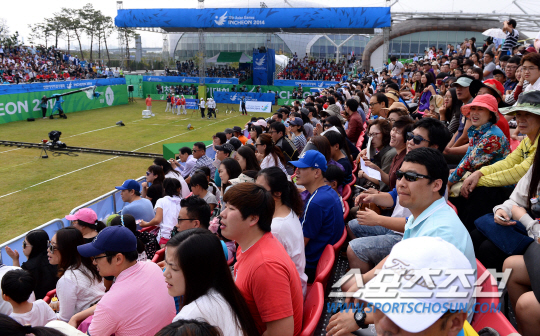 28일 인천 계양아시아드양궁장에서 2014 인천아시아경기대회 남녀 양궁 리커브 단체전과 개인전 결선 경기가 열렸다. 양궁장을 찾은 많은 시민들이 양궁의 묘미를 즐기고 있다. 여자 단체전을 관전하고 있는 팬들.