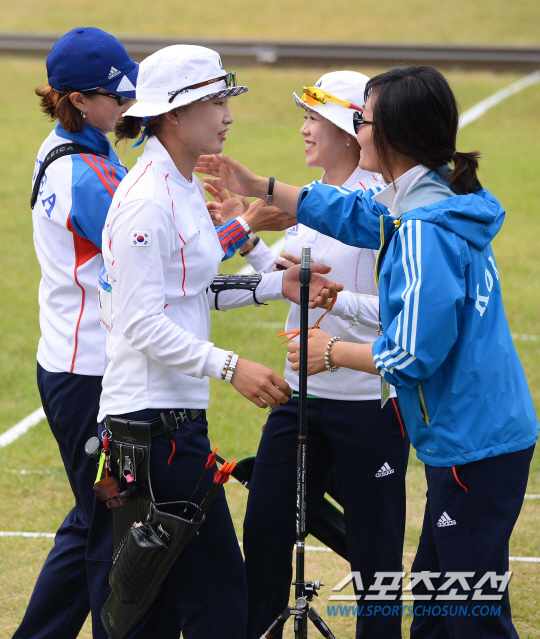 28일 인천 계양아시아드양궁장에서 2014 인천아시아경기대회 여자 양궁 리커브 개인전 결승 경기가 열렸다. 여자양궁 개인전 결승에서 만난 장혜진, 정다소미가 금메달을 향해 대결을 펼쳤다. 정다소미가 장혜진에 승리하며 금메달을 획득했다. 금메달과 은메달을 차지한 정다소미(왼쪽 두 번째)와 장혜진이 포옹을 나누고 있다.