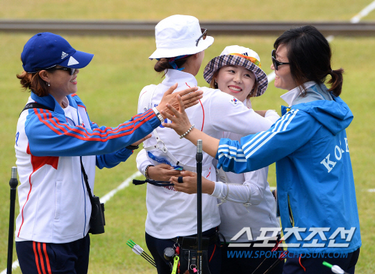 28일 인천 계양아시아드양궁장에서 2014 인천아시아경기대회 여자 양궁 리커브 개인전 결승 경기가 열렸다. 여자양궁 개인전 결승에서 만난 장혜진, 정다소미가 금메달을 향해 대결을 펼쳤다. 정다소미가 장혜진에 승리하며 금메달을 획득했다. 금메달과 은메달을 차지한 정다소미(왼쪽 두 번째)와 장혜진이 포옹을 나누고 있다.