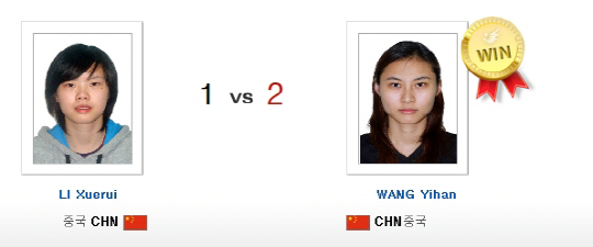 왕이한은 2년 전 런던올림픽에서 단식 준우승을 했었다. 그때 결승전에서 리슈에루이에게 졌었다. 이번에 금은의 주인공이 뒤바뀌었다. 한국의 배연주는 동메달을 차지했다. 배연주는 준결승전에서 왕이한에 1대2로 졌었다.