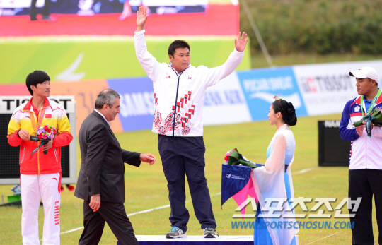 28일 인천 계양아시아드양궁장에서 2014 인천아시아경기대회 남자 양궁 리커브 개인전 경기가 열렸다. 금메달을 따낸 오진혁이 금메달을 수상하고 있다.
