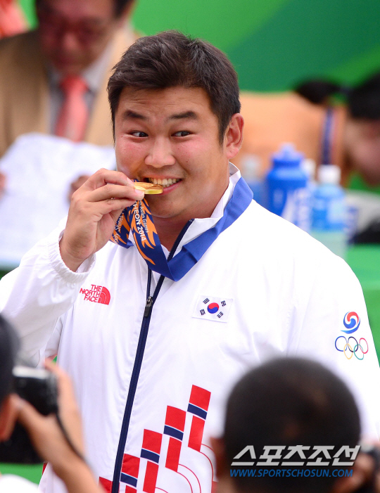 28일 인천 계양아시아드양궁장에서 2014 인천아시아경기대회 남자 양궁 리커브 개인전 경기가 열렸다. 금메달을 따낸 오진혁이 금메달과 함께 포즈를 취하고 있다. 인천=송정헌 기자 songs@sportschosun.com/2014.09.28