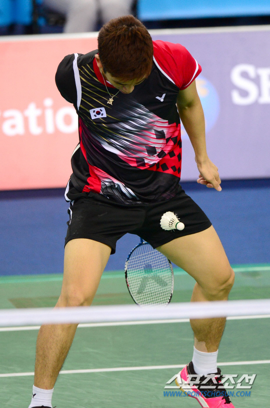 28일 인천 계양체육관에서 2014 인천아시아경기대회 남자 배드민턴 단체전 결승 경기가 열렸다. 세계랭킹 1위 이용대-유연성 조는 모하메드 아산-헨드라 세티아완(인도네시아) 조와 금메달 놓고 마지막 승부를 펼쳤다. 이용대가 셔틀콕을 받아내지 못하고 있다.
