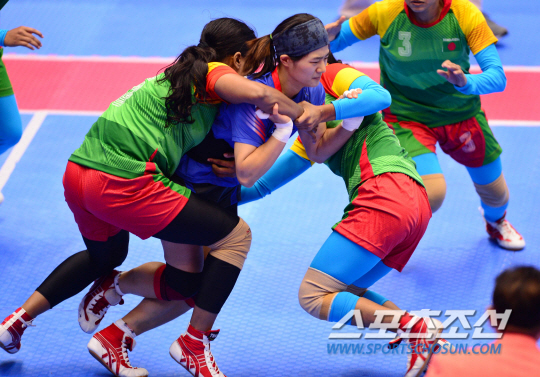 29일 오전 인천 송도글로벌대학체육관에서 2014 인천 아시안게임 카바디 한국과 방글라데시의 경기가 열렸다. 카바디는 공격수 한명이 수비 진영으로 넘어가 수비수를 터치한 후 자신의 진영으로 넘어오거나 그 공격수를 잡아 자기 진영으로 넘어가지 못하게 하면 점수를 얻는 경기다. 경기에서 한국 임재원이 방글러데시 수비수들에게 잡히고 있다.