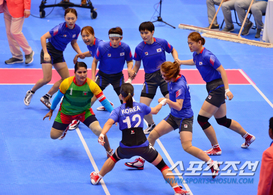 29일 오전 인천 송도글로벌대학체육관에서 2014 인천 아시안게임 카바디 한국과 방글라데시의 경기가 열렸다. 카바디는 공격수 한명이 수비 진영으로 넘어가 수비수를 터치한 후 자신의 진영으로 넘어오거나 그 공격수를 잡아 자기 진영으로 넘어가지 못하게 하면 점수를 얻는 경기다. 경기에서 한국 선수들이 수비를 하고 있다.