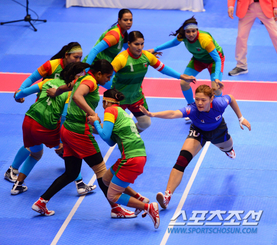 29일 오전 인천 송도글로벌대학체육관에서 2014 인천 아시안게임 카바디 한국과 방글라데시의 경기가 열렸다. 카바디는 공격수 한명이 수비 진영으로 넘어가 수비수를 터치한 후 자신의 진영으로 넘어오거나 그 공격수를 잡아 자기 진영으로 넘어가지 못하게 하면 점수를 얻는 경기다. 경기에서 한국 윤유리가 방글라데시 진영에서 공격을 하고 있다.