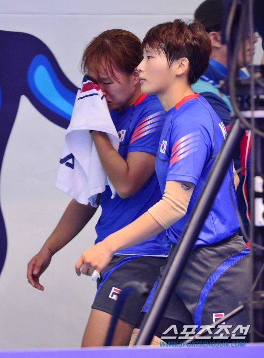 29일 오전 인천 송도글로벌대학체육관에서 2014 인천 아시안게임 카바디 한국과 방글라데시의 경기가 열렸다. 카바디는 공격수 한명이 수비 진영으로 넘어가 수비수를 터치한 후 자신의 진영으로 넘어오거나 그 공격수를 잡아 자기 진영으로 넘어가지 못하게 하면 점수를 얻는 경기다. 방글라데시에 패배한 후 한국 신소미가 눈물을 흘리며 퇴장하고 있다.