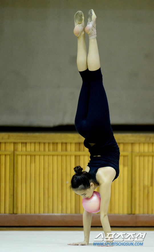 '리듬체조 요정' 손연재가 인천아시안게임 출전을 앞두고 29일 인천 서운고등학교 체육관에서 첫 훈련을 했다. 손연재가 볼 훈련을 하고 있다.