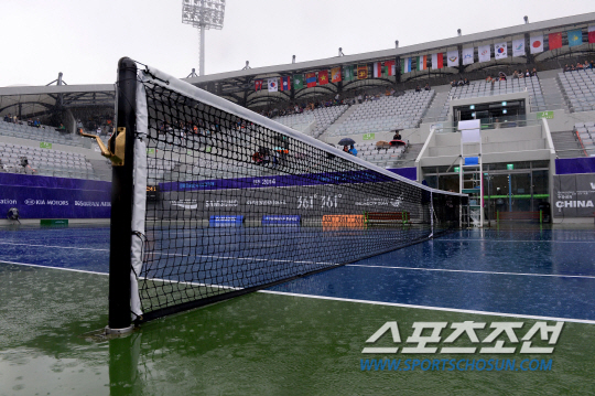 29일 인천 열우물테니스경기장에서 2014인천아시아경기대회 남자 테니스 복식 결승전 한국과 인도의 경기가 펼쳐질 예정이다. 하지만, 많은 비로 인해 경기가 지연되고 있다.