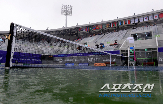 29일 인천 열우물테니스경기장에서 2014인천아시아경기대회 남자 테니스 복식 결승전 한국과 인도의 경기가 펼쳐질 예정이다. 하지만, 많은 비로 인해 경기가 지연되고 있다.