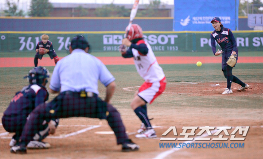 29일 오후 인천 송도LNG야구장에서 2014 인천 아시안게임 소프트볼 예선전 한국과 일본의 경기가 열렸다. 한국 박수연이 일본 선수를 상대로 힘차게 볼을 던지고 있다.