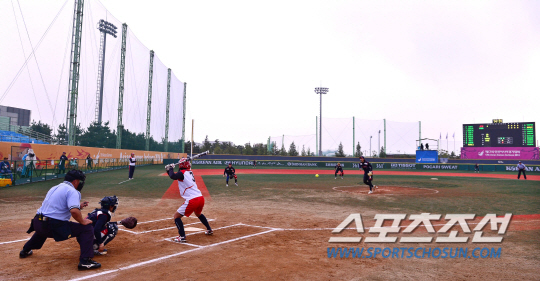 29일 오후 인천 송도LNG야구장에서 2014 인천 아시안게임 소프트볼 예선전 한국과 일본의 경기가 열렸다. 한국 박수연이 일본 선수를 상대로 힘차게 볼을 던지고 있다.