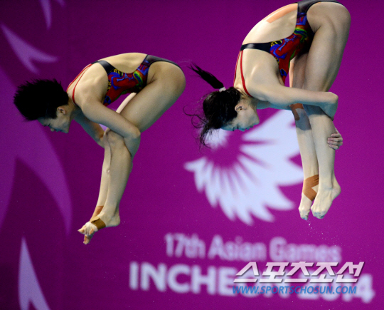 인천 아시안게임 여자 다이빙 3m 스프링보드 싱크로나이즈 결승전이 29일 인천 박태환수영장에서 열렸다. 금메달을 차지한 중국 스팅마오-우민샤 조가 멋진 연기를 펼치고 있다.