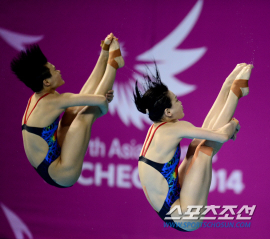 인천 아시안게임 여자 다이빙 3m 스프링보드 싱크로나이즈 결승전이 29일 인천 박태환수영장에서 열렸다. 금메달을 차지한 중국 스팅마오-우민샤 조가 멋진 연기를 펼치고 있다.